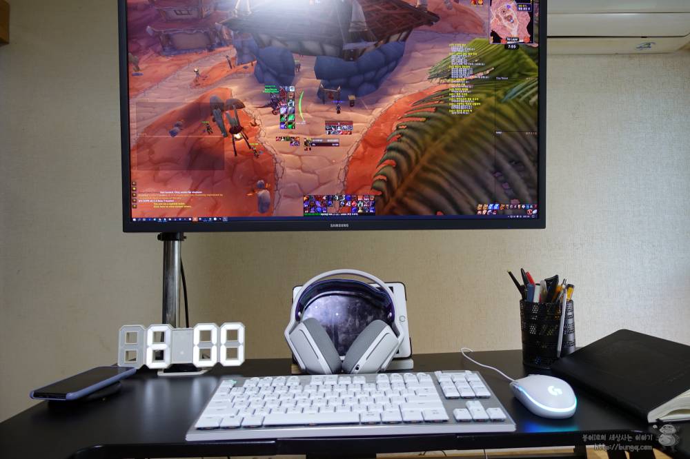 실제로 검은 색이 많은 책상과 모니터의 환경에 로지텍 G913 TKL 화이트 세트를 세팅해봐도 상당히 잘 어울립니다. 주로 블랙 제품들을 사용해서 그런지 이런 화이트 제품들의 등장은 꽤 신선한 기분 전환이 되어주기도 합니다.
