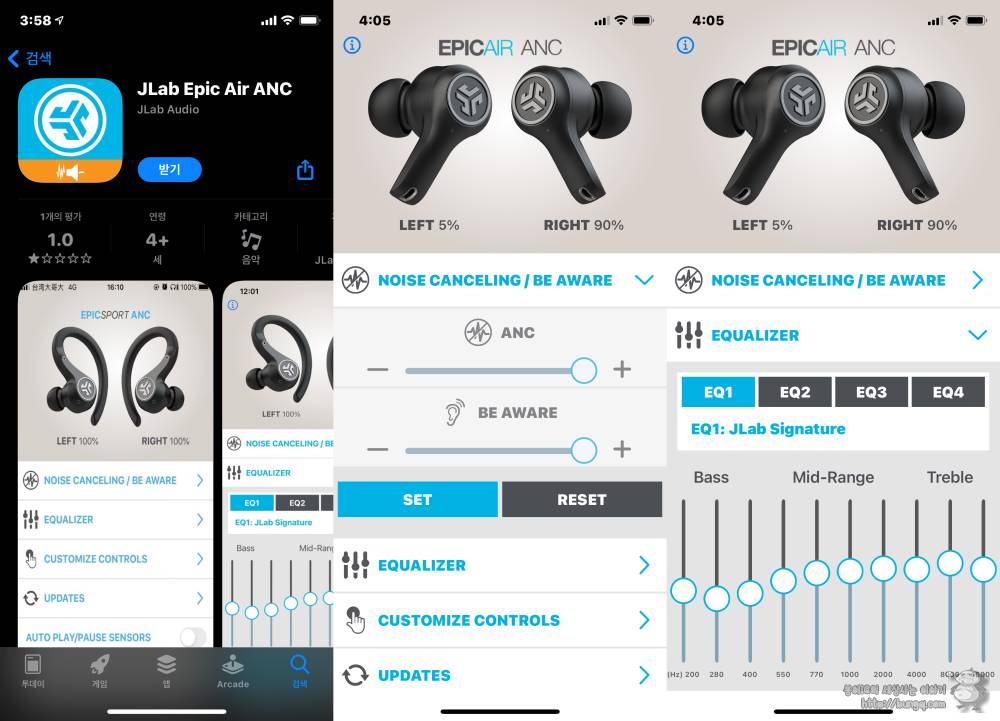 앱스토어에서 손쉽게 다운로드 받을 수 있고 노이즈 캔슬링 설정(ANC, BE AWARE)과 이퀄라이저 설정도 변경이 가능합니다. 에픽 에어 ANC 이어버드의 터치센서를 통해서도 변경이 가능하지만 앱을 통해 직관적으로 이용하는게 좋더군요.